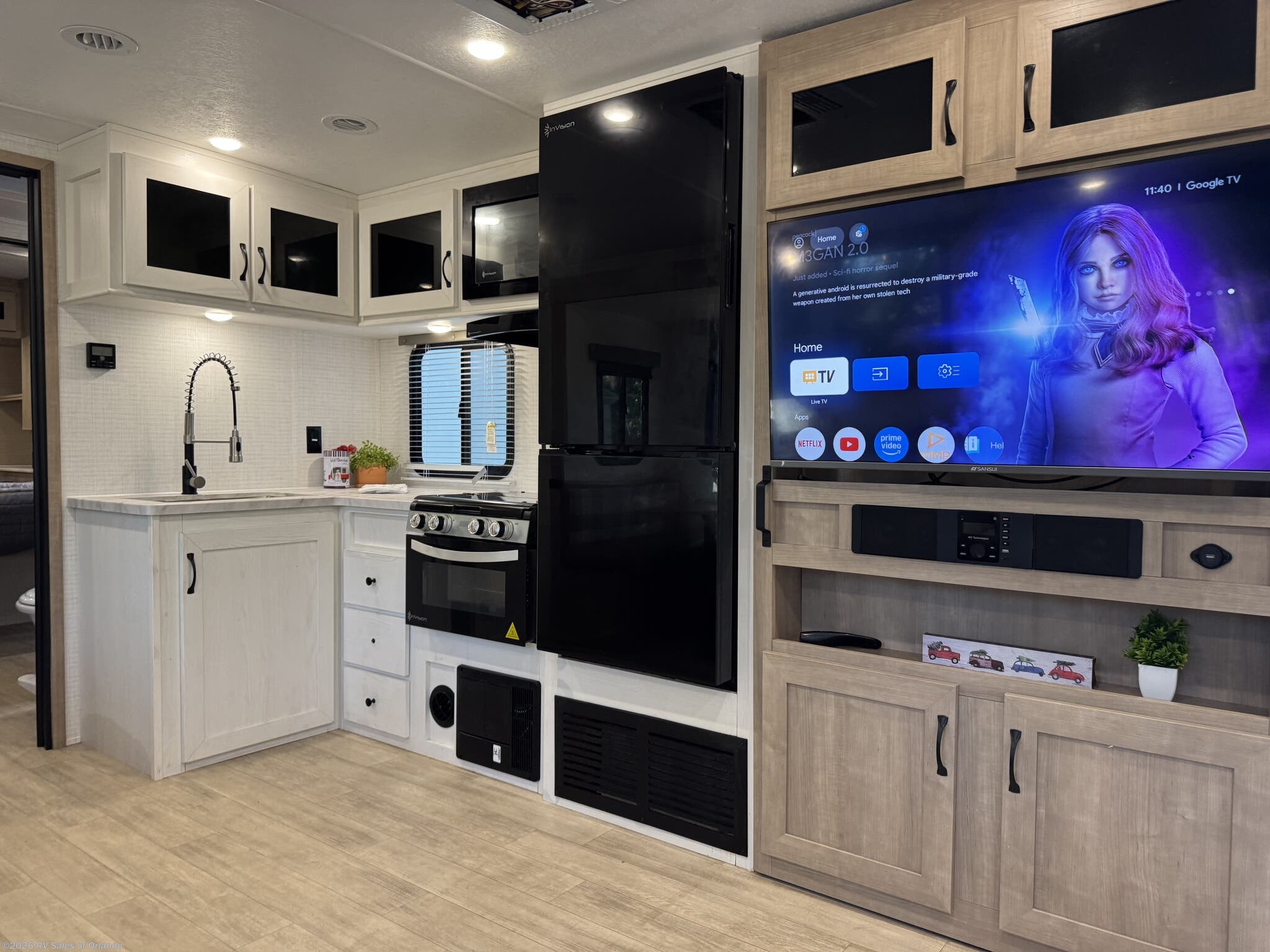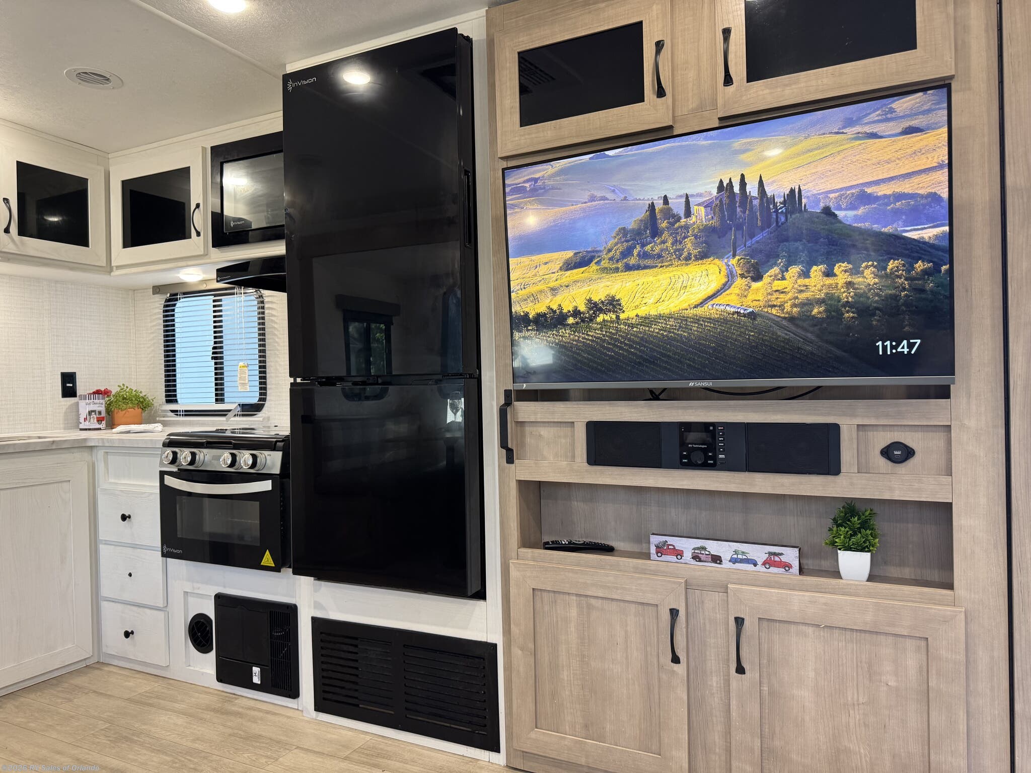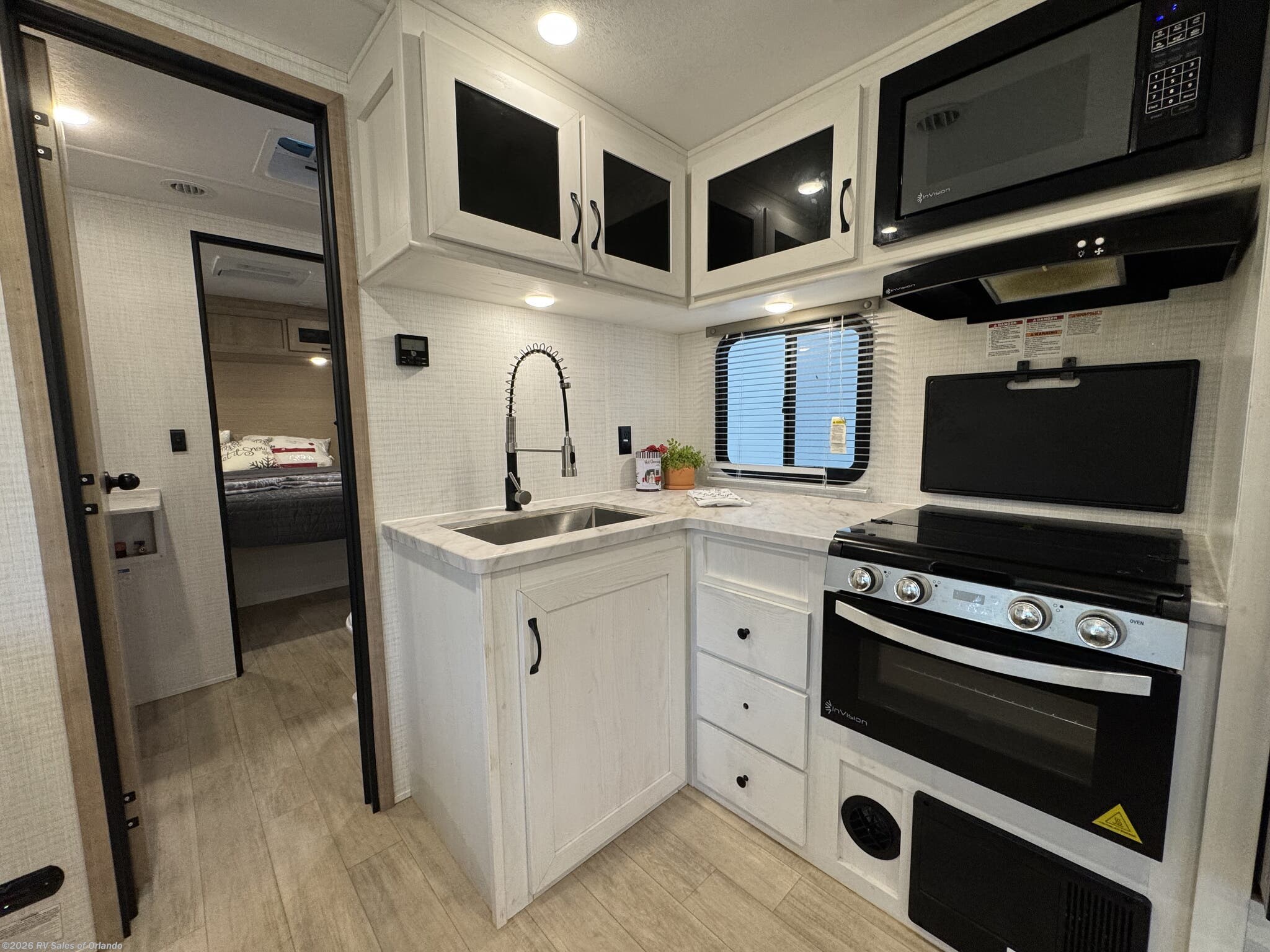 - Kitchen includes 11 cu ft electric refrigerator, 3-burner cooktop, microwave, L-shaped countertop, hidden pantry